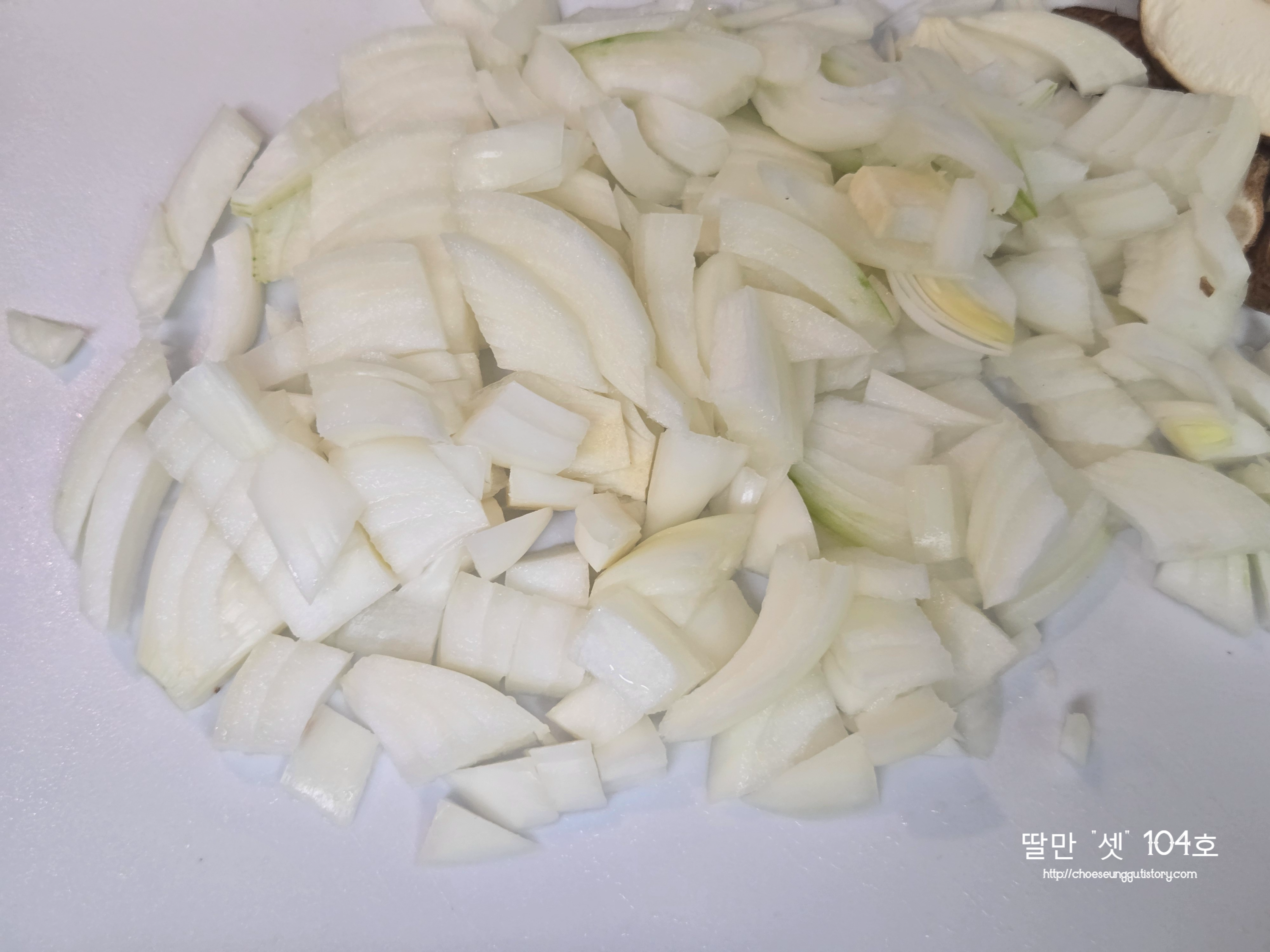 양송이버섯은 채 썰어서 준비하고 양파는 다지듯이 썰어준다.